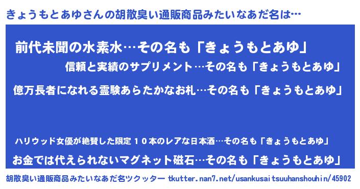 | 男性向けラノベタイトル風あだ名 | 『きょうもとあゆ~年齢イコール彼女いない歴の魔法使い~』 |