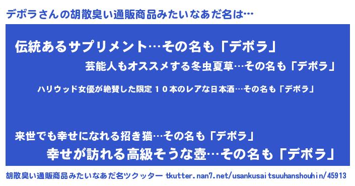 | 意味不明あだ名 | 『住所不定無職デボラ(53歳)』『自称デボラ』 |