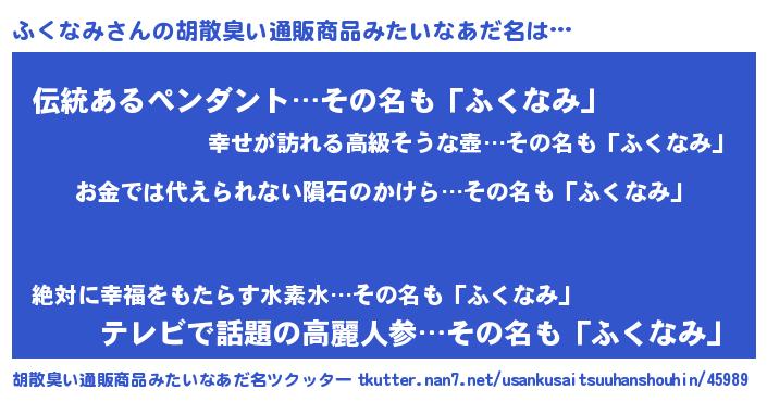 | ヘコむあだ名 | 『ふくぷりん』『豆乳』『ふくもー』 |