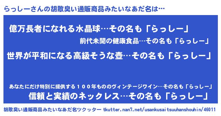 | 男性向けラノベタイトル風あだ名 | 『やはりらっしーの青春ラブコメはまちがっている 』 |