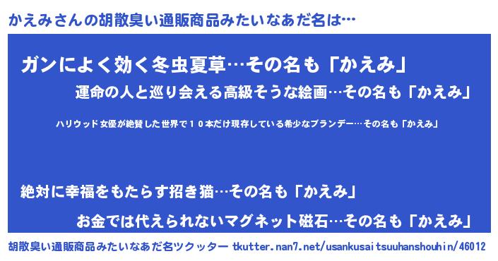 | 意味不明あだ名 | 『住所不定無職かえみ(91歳)』『自称かえみ』 |