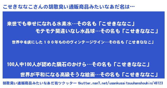 | 男性向けラノベタイトル風あだ名 | 『この素晴らしい世界にこせきななこを!』 |