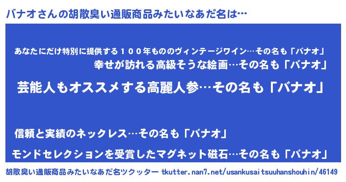 | 男性向けラノベタイトル風あだ名 | 『バナオ~年齢イコール彼女いない歴の魔法使い~』 |