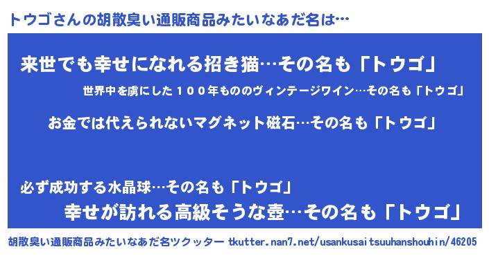| 欧米人風あだ名 | 『トリンドルトウゴ』『ダニエルトウゴ』 |