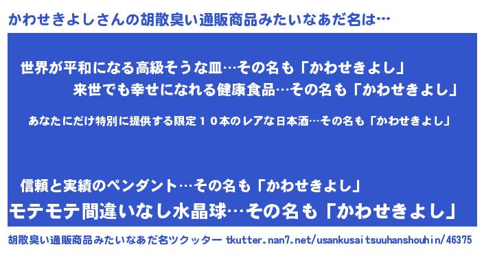 | 恥ずかしいあだ名 | 『かわっちょ』『プリティーかわせきよし』 |