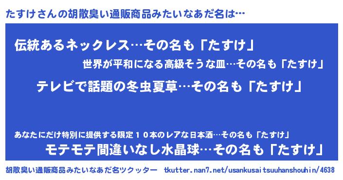 | 男性向けラノベタイトル風あだ名 | 『Re:たすけから始める異世界生活』 |