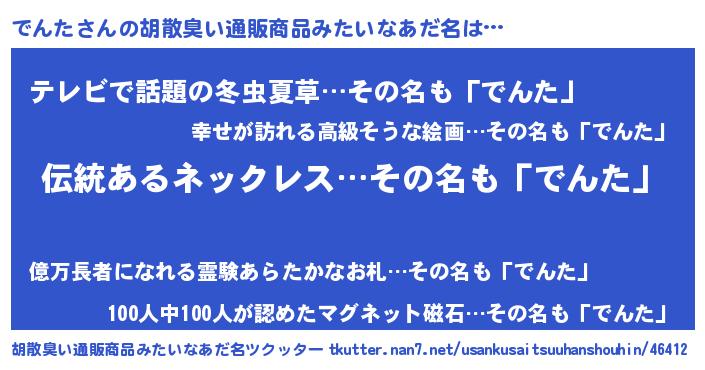 | 男性向けラノベタイトル風あだ名 | 『でんたに滅ぼされるだけの簡単なお仕事です』 |