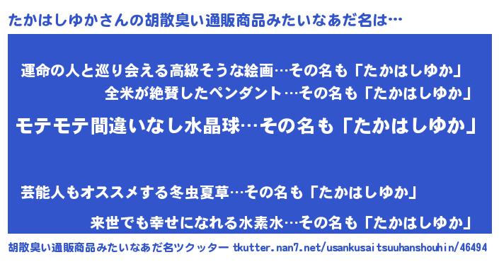 | 恥ずかしいあだ名 | 『プリティーたかはしゆか』『たかっちょ』 |