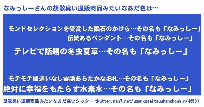 | 男性向けラノベタイトル風あだ名 | 『転生したらなみっしーだった件』 |