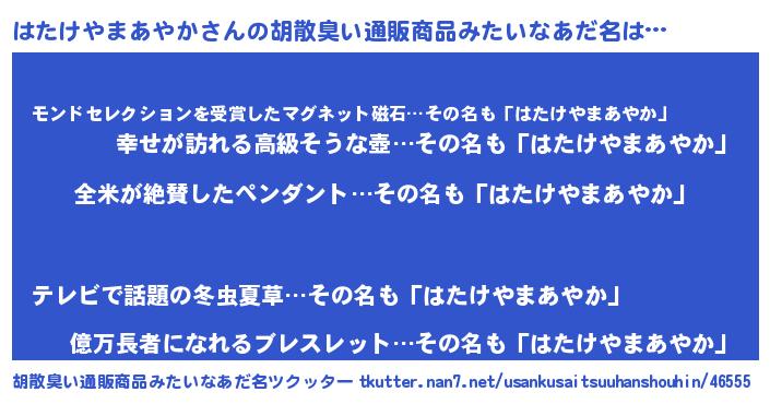 | 男性向けラノベタイトル風あだ名 | 『はたけやまあやかの嫁は女の子じゃないと思った?』 |