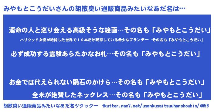 | ヘコむあだ名 | 『みやもー』『レバニラ』『みやっぺ』 |