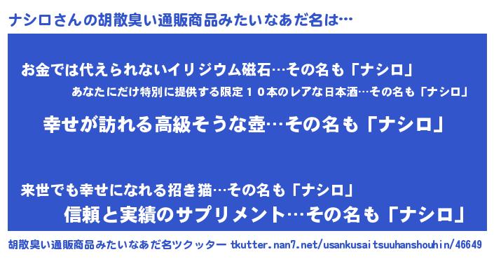 | 女子向けラノベタイトル風あだ名 | 『ナシロの雑貨屋さん』『ナシロ恋絵巻』 |