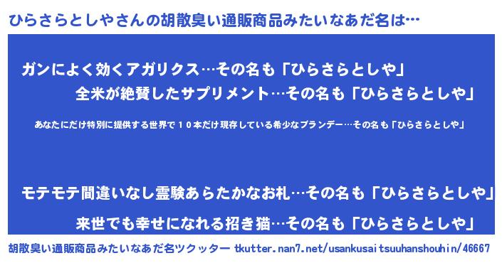 | ヘコむあだ名 | 『ひらさらとしや(遠い目)』『ひら太郎』 |