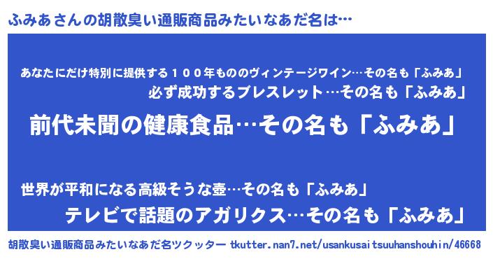 | ヘコむあだ名 | 『ふみあ(笑)』『ふみにー』『ふみを』 |