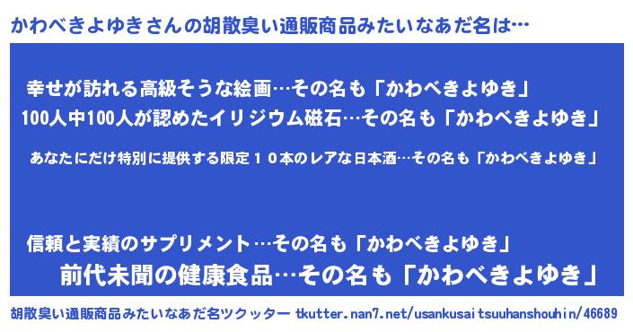 | 意味不明あだ名 | 『住所不定無職かわべきよゆき(59歳)』 |