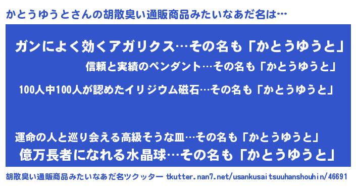 | 男性向けラノベタイトル風あだ名 | 『おまえをオタクにしてやるから、俺をかとうゆうとにしてくれ! 』 |