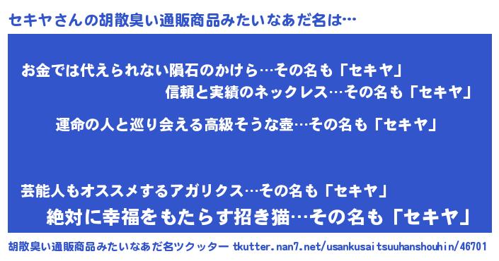 | ヘコむあだ名 | 『酢こんぶ』『セキヤ(遠い目)』 |