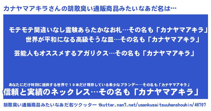 | 男性向けラノベタイトル風あだ名 | 『カナヤマアキラに滅ぼされるだけの簡単なお仕事です』 |