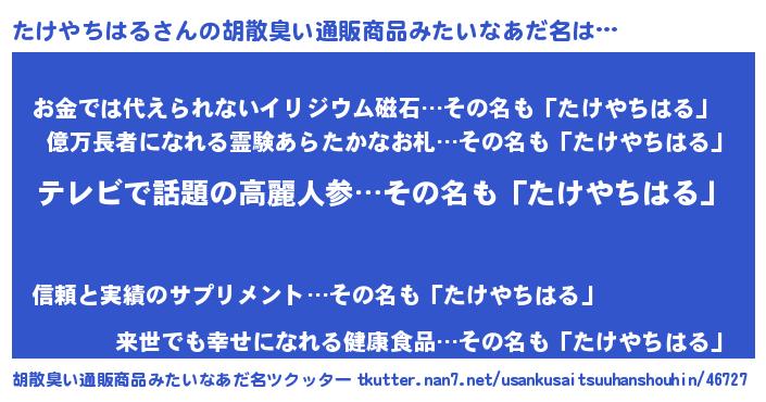 | ヘコむあだ名 | 『たけやちはる(笑)』『たけにゅー』 |
