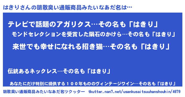 | 女子向けラノベタイトル風あだ名 | 『はきりの契約王妃』『はきり恋絵巻』 |