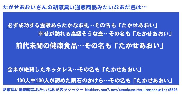 | ヘコむあだ名 | 『たかせあおい(苦笑)』『たかもー』 |