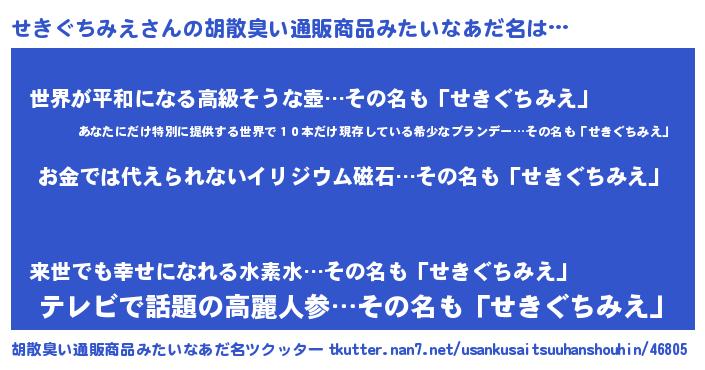| ヘコむあだ名 | 『豆乳』『せきぐちみえ(爆)』 |