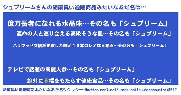 | ヘコむあだ名 | 『シュにゅー』『シュプリーム(爆)』 |