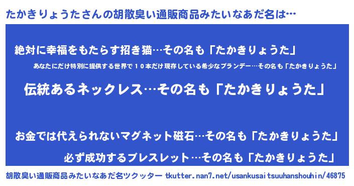 | ヘコむあだ名 | 『たか太郎』『たかきりょうた(笑)』 |