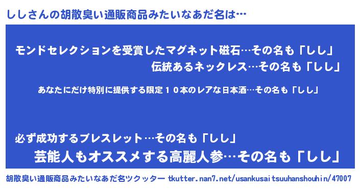 | 意味不明あだ名 | 『住所不定無職しし(41歳)』『自称しし』 |