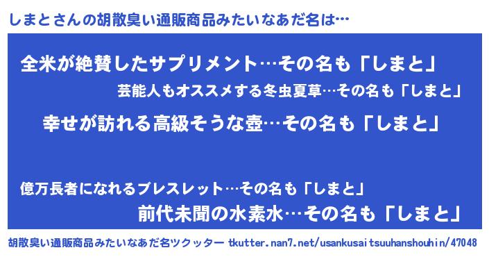 | ヘコむあだ名 | 『つくし』『しまを』『しまっふぃ~』 |