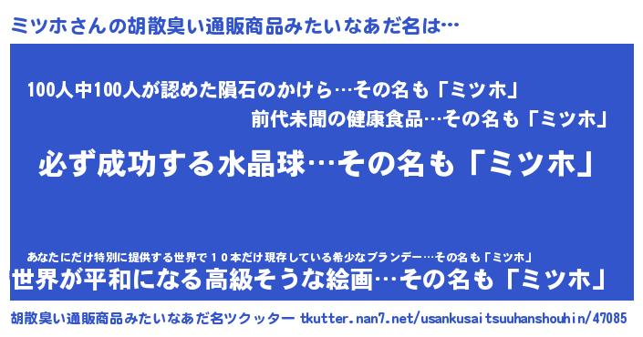 | ヘコむあだ名 | 『ミツもー』『つくし』『ミツホ(爆)』 |