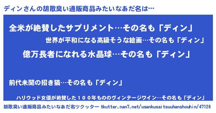 | 男性向けラノベタイトル風あだ名 | 『ディンに滅ぼされるだけの簡単なお仕事です』 |