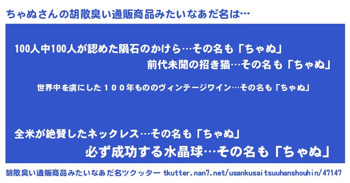 | ヘコむあだ名 | 『ちゃふぇ~』『ちゃぬ(遠い目)』 |