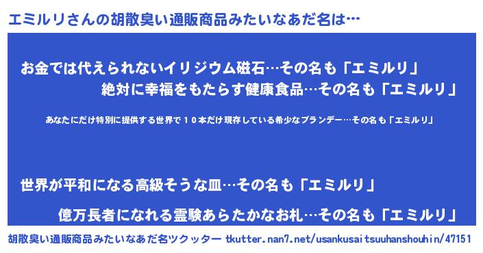 | ヘコむあだ名 | 『エミっふぃ~』『エミルリ(震え声)』 |