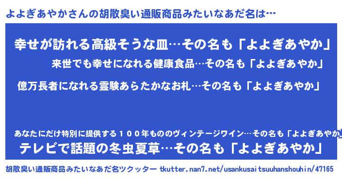 | 恥ずかしいあだ名 | 『プリティーよよぎあやか』『よよっちょ』 |