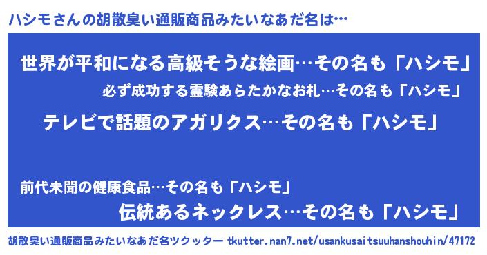 | 男性向けラノベタイトル風あだ名 | 『転生したらハシモだった件』 |