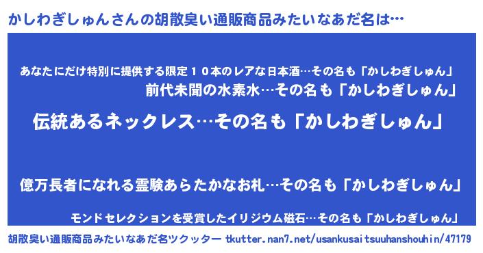 | ヘコむあだ名 | 『かしっ子』『かしわぎしゅん(小並感)』 |