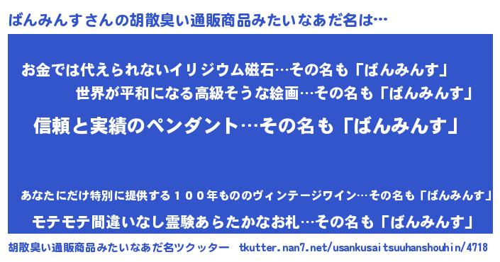 | 意味不明あだ名 | 『めかぶ科ばんみんす属』 |