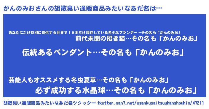 | 欧米人風あだ名 | 『ウサインかんのみお』 |