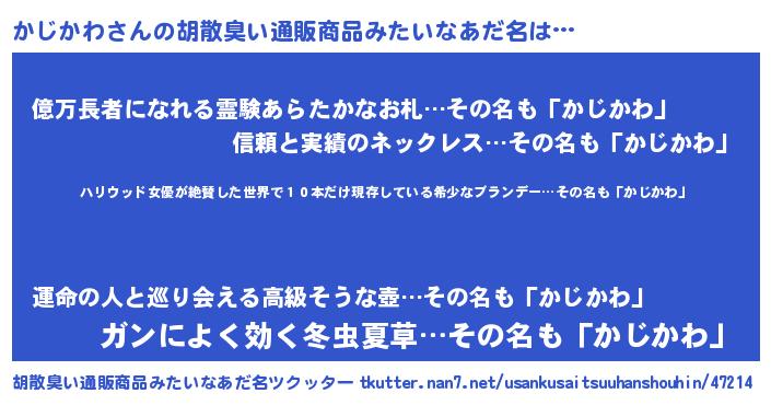 | 男性向けラノベタイトル風あだ名 | 『魔弾の王とかじかわ』『かじかわの憂鬱』 |