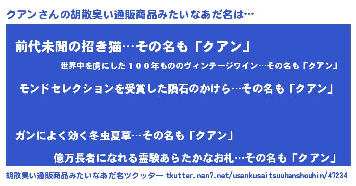 | 男性向けラノベタイトル風あだ名 | 『ノーゲーム・ノークアン』 |