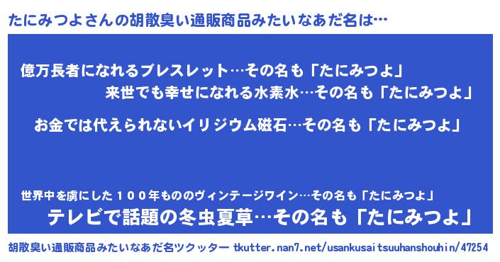 | 男性向けラノベタイトル風あだ名 | 『転生したらたにみつよだった件』 |