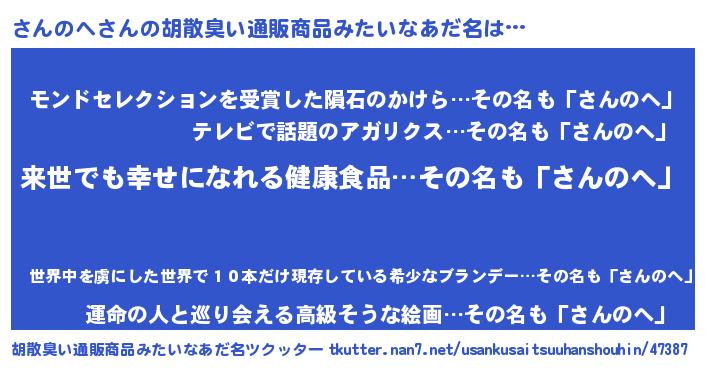| 意味不明あだ名 | 『永久保存さんのへ』『自称さんのへ』 |