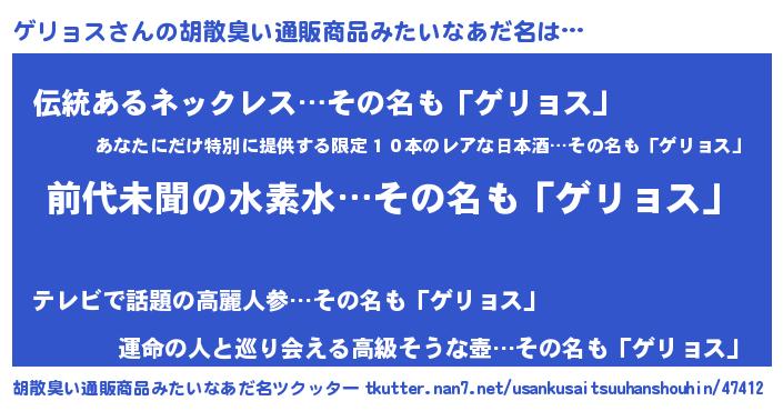 | ヘコむあだ名 | 『ゲリョス(苦笑)』『ゲリっぺ』 |