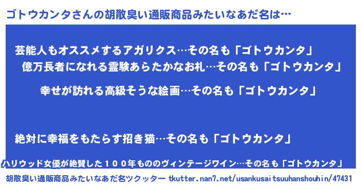 | 肩書あだ名 | 『ゴトウカンタ総理大臣』 |