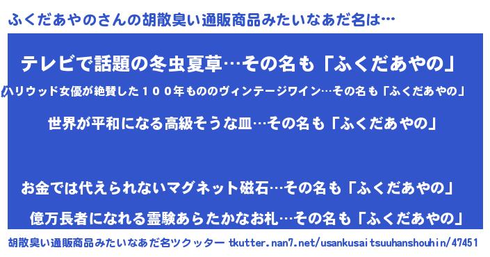 | 欧米人風あだ名 | 『ふくだあやの・ステッグマイヤー』 |