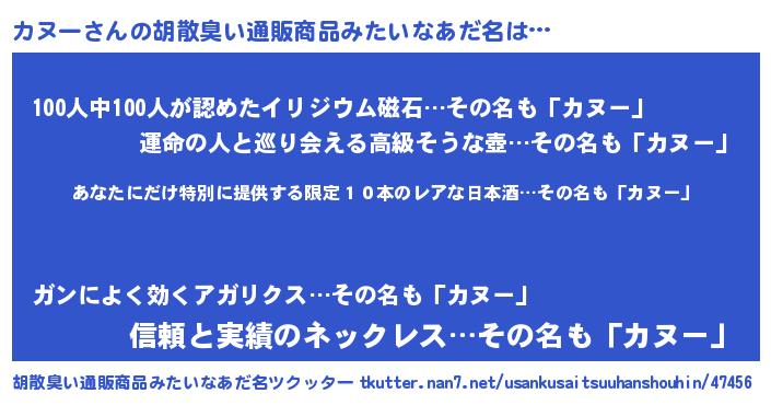 | 意味不明あだ名 | 『住所不定無職カヌー(40歳)』『自称カヌー』 |