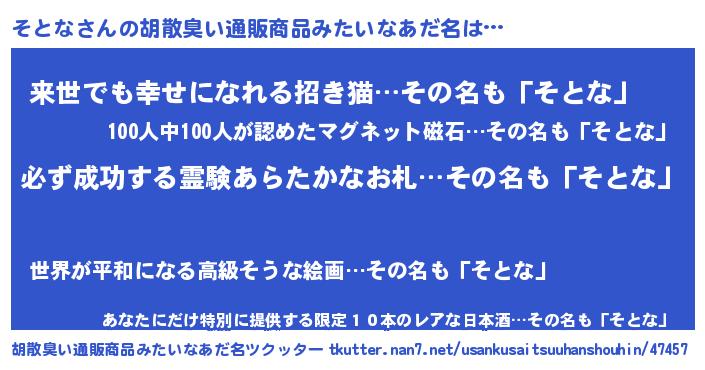| 男性向けラノベタイトル風あだ名 | 『そとなの憂鬱』『ソトナスレイヤー』 |