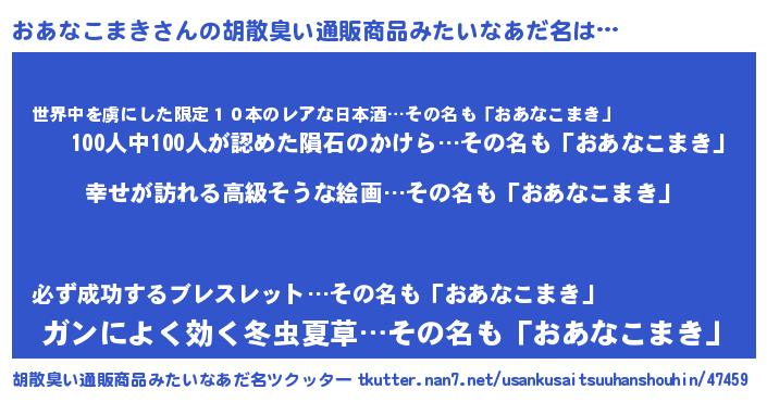 | 男性向けラノベタイトル風あだ名 | 『やはりおあなこまきの青春ラブコメはまちがっている 』 |
