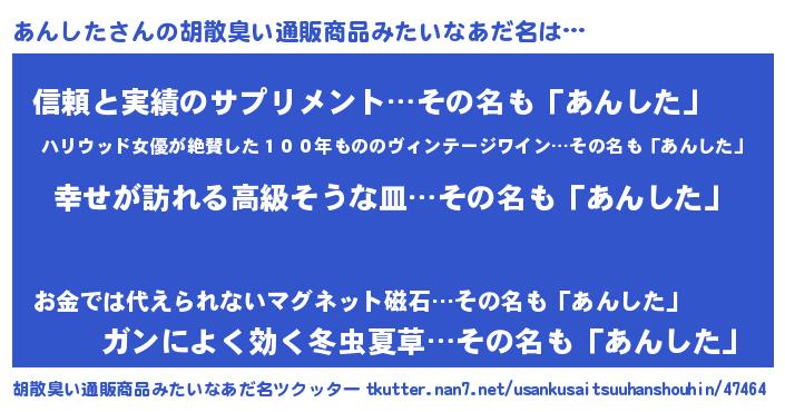 | 男性向けラノベタイトル風あだ名 | 『アンシタスレイヤー』 |